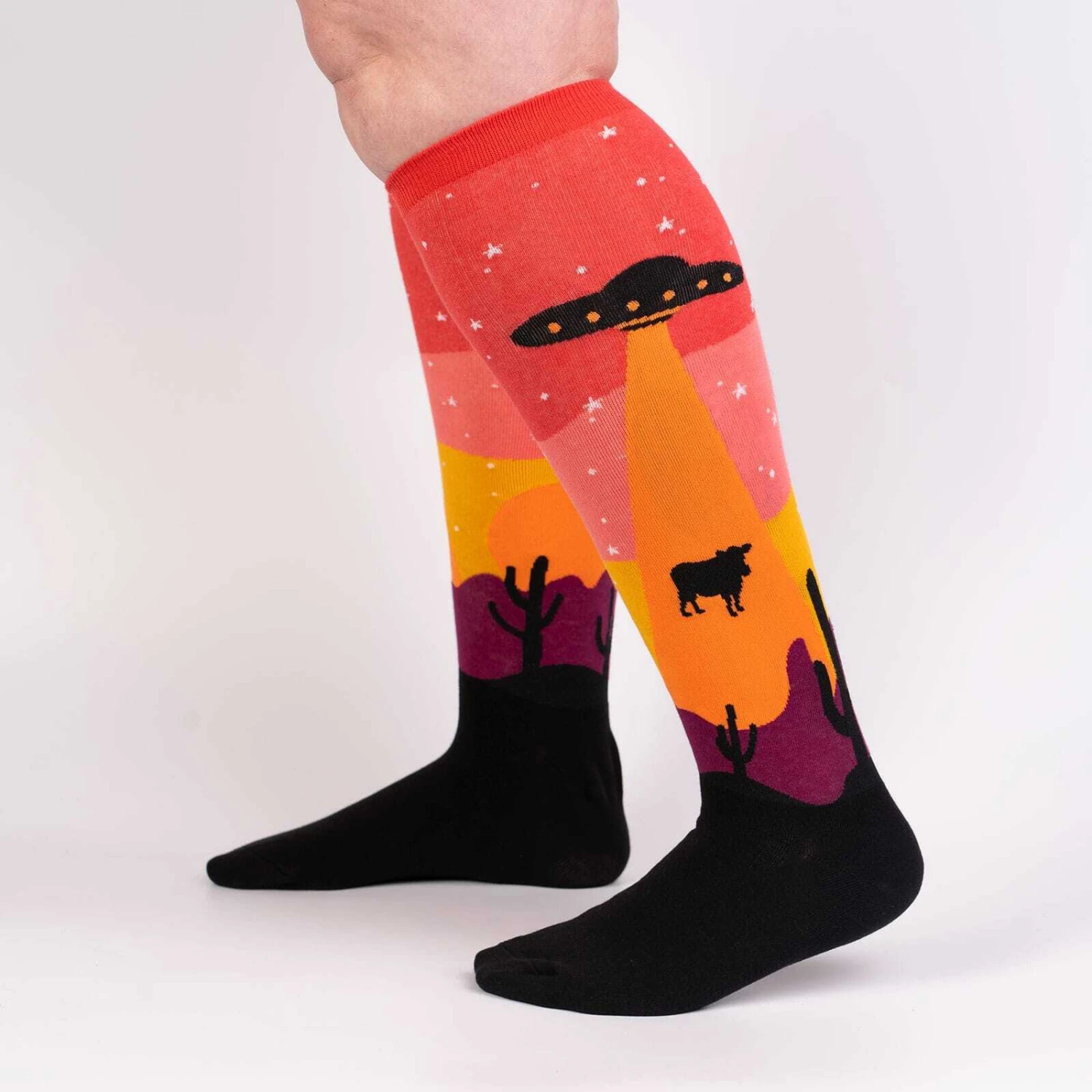 Area 51 is a highly classified secret U.S. Air Force military installation located in southern Nevada. For years there was speculation about the installation, especially amid growing reports of UFO sightings in the vicinity. Area 51 has become known for it’s conspiracy theories and folklore of UFOs and aliens being housed at the base. So what do you think? Is it just experimental aircraft and weapons testing going on there? Or is there something out of this world going on there? There are rumors of an alien spacecraft crashing near Area 51 long ago, and a shadowy government agency conducting research on the wreckage at a tightly guarded compound. What would aliens come to earth for? To test their tractor beams with one of the largest animals grazing this earth, cows! These Area 51 Crew Socks pay homage to what may have caused that mysterious crash. For all you believers, these Area 51 alien themed socks are for you! These knee highs are super stretchy, up to 21 inches in circumference without distorting the graphics. These knee high won’t fall down, no matter your leg size. Fits women’s shoe size 5 to 14.5 and men’s shoe size up to 13. Content: 60% cotton, 37% polyester, 3% spandex.