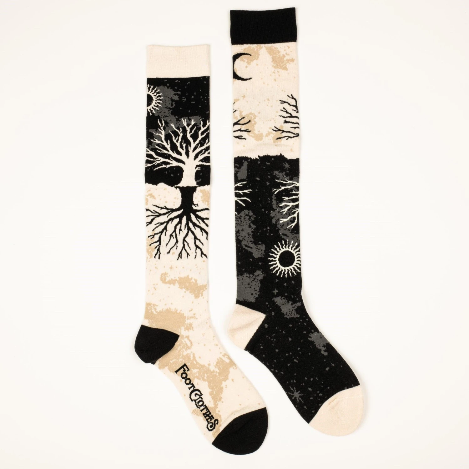 What happens on a higher level of reality also happens on lower levels; the microcosm and macrocosm behave alike. These compelling socks feature a mirror image tree on each sock. Trees are silhouetted on a light beige and alternatively black background and feature the moon and sun. Crafted from a super soft cotton blend, double terry in the reinforced heel and toe area and smooth seams add durability and comfort with a high thread count so they’re like fancy sheets – but for your feet!