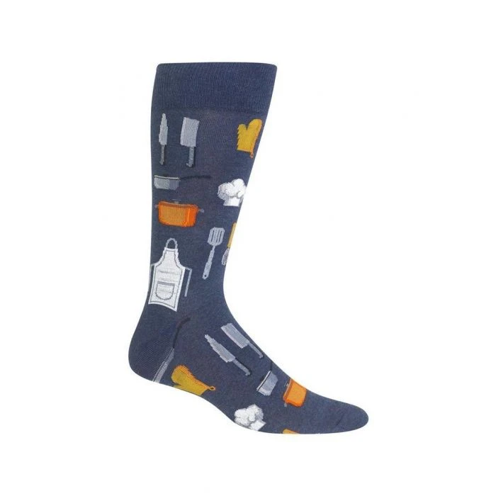 We love a guy who knows his way around a kitchen. Especially if he shares his delicious creations! Especially if he cleans up afterwards! Denim blue background, kitchen utensils galore…pots, pans, cleavers, knives, spatula, oven mitt, apron and chef’s hat!  50% cotton, 26% nylon, 22% polyester, 2% spandex. Fits approximate men’s shoe sizes 6–12.5.