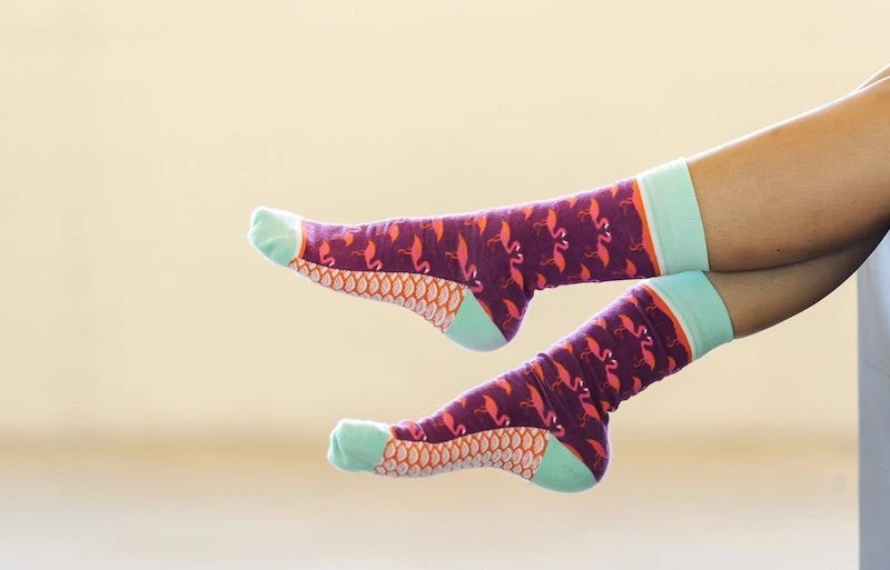 Flirty flamingos look perfect on purple. You’ll want to flaunt your feet when you wear these fantastic feathered friends! With a print of pink flamingos against purple gazing into each others eyes, aqua on the heels and toes, and tan alternating pattern in white and orange on the soles. Each pair of socks is made with high quality woven cotton that feels soft and luxurious and features extra padding in the toes and heels to make your feet extra happy.