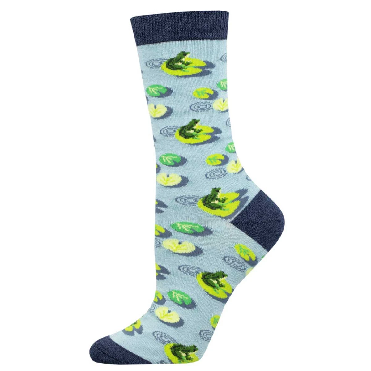 The impressionist painter Claude Monet often used water lilies as a subject. In fact, he painted more than 250 pieces that featured this aquatic plant. These sweet socks feature green frogs relaxing on lily pads, taking in the beauty of the day. Soft, luxurious bamboo rayon is breathable and antimicrobial so in addition to looking good, they feel great. Certified organic by OCIA and tested by OEK-TEX to be free of harmful chemicals. Bamboo socks are also anti-fungal so your feet stay comfortable and healthy. This pair of bamboo socks features a seamless toe for ultimate comfort. This means this style has a minimal, “barely there” seam designed to not irritate the toes. Fits women’s shoe size 5-10.5. Content: 54% rayon from bamboo, 44% nylon, 2% spandex.