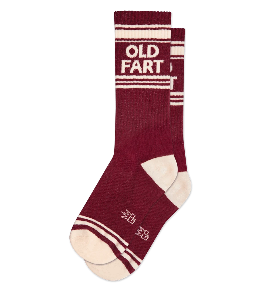 Is it your Dad? Your Mom? Your brother? Your Sister? Your BFF? Your Grandfather? Maybe even you? Everyone knows an old fart. They hate loud noises. They hate surprises. They want those dang kids to stay off their lawn (shakes fist). They’ll tell anyone about how they know it’s gonna rain on account of their sore toe, whether they want to hear about it or, more likely, not. They like to be comfortable and they don’t give a hoot if they embarrass you while they’re at it (hello fanny pack). Now there are the perfect socks for all the curmudgeons in your life. These “Old Fart” socks for Old Farts will warm those cold feet (and sore toe). Bonus: they look mortifyingly awesome with sandals! In colors reminiscent of grandpa’s favorite, cozy sweater (maroon and cream)! These wide ribbed athletic style socks reach to mid-calf on most folks and fit a women’s size 6 US to men’s size 15, 🇺🇸Made in USA 🇺🇸.  65% cotton, 32% nylon, 3% spandex.