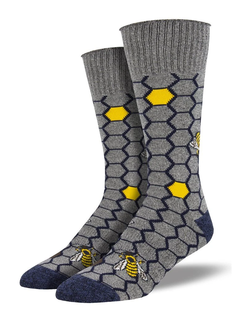 Busy Bees and honeycomb boot socks are here to help you buzz through the day! These cozy and sturdy socks are designed with special features such as a cushioned footbed and reinforced arches for hiking and other outdoor activities. These socks are made from a blend of quality recycled materials. Dark grey accent at toe and heel, charcoal grey background with honey yellow accents, all over honeycomb pattern and yellow and black bees.Â