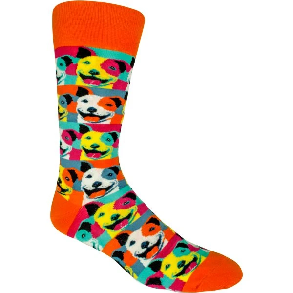 Show your love of dogs and modern art all in one sock! Pop art and pit bulls both share some controversy from time to time but they make perfect companions on these fun, colorful socks. Pit Bull head shots repeated in bright, pop art style in pink, orange, blue, yellow and white.                                      65% cotton, 24% nylon, 8% polyester, 3% spandex. Fits approximate men’s shoe sizes 8–13.