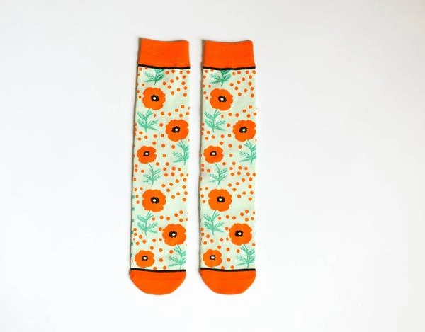 With a print of cheery orange poppies and dots against an ivory background, orange on the heels and toes, and green and ivory stripes on the soles. Each pair of socks is made with high quality woven cotton that feels soft and luxurious and features extra padding in the toes and heels to make your feet extra happy.