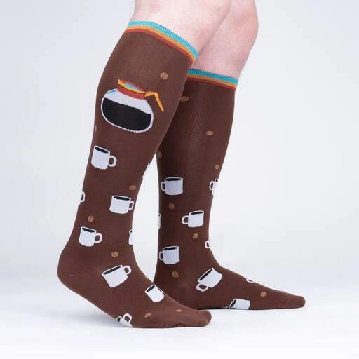 If a freshly brewed pot of coffee is the first thing that comes to mind when you hear the word “pot”, we have the socks for you. There is no possible way you are going to OR even able to start your day without a cup of coffee. You always say yes when the server asks if you want more coffee at a restaurant. You will always say yes when someone asks if you want to go on a coffee run. You get very, very cranky if you haven’t had any coffee. Dripped, perked, pressed, iced. Cafe latte, cappuccino, French vanilla. Instant, if desperate enough. You my friend, are a Pot Head. A Coffee Pot Head, that is. Welcome to the club! Now…how do we get a refill? The threads in these socks are certified by OEKO-TEX® Standard 100, which means harmful chemicals are left out to keep your skin safe and happy. These knee highs are super stretchy, up to 21 inches in circumference without distorting the graphics. These knee high won’t fall down, no matter your leg size. Fits women’s shoe size 5 to 14.5 and men’s shoe size up to 13. Content: 60% cotton, 37% polyester, 2% spandex.