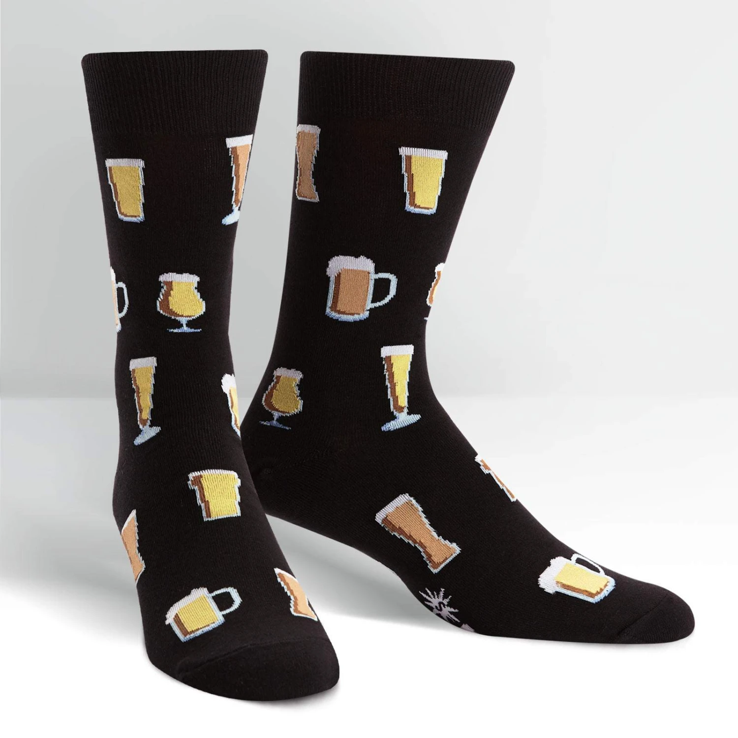 Cheers, Prost! Raise a glass in celebration…in fact, not just any ol’ glass. Pint, Imperial Pint, Pilsner Tulip, Weizen, Bier Mug…they’re all here! Ever wonder why there are so many different glasses for different types of beer? The beer glass shape can affect the head retention and aroma of the particular beer you are drinking. And of course, presentation is everything. Show your affinity for all of the the brewskis out there with our Prost crew socks for men. Black background, variety of full beer glasses artfully arranged.Â