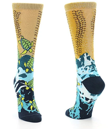 Adventurous sea turtles make their way down a sandy beach to crystal blue waters. Gorgeous detail and vibrant colors make this pair hard to resist! The best part? Ozone donates a portion of proceeds to sea turtle conservation. 85% cotton, 14% nylon, 1% spandex. Fits approximate women’s shoe sizes 5–10.5