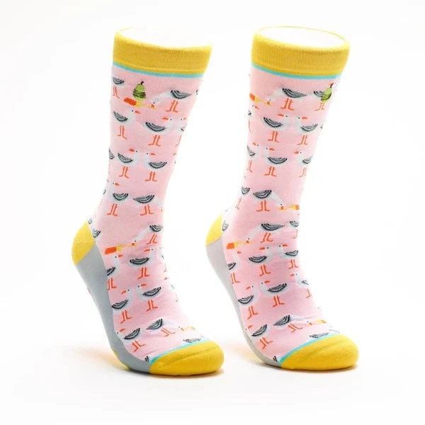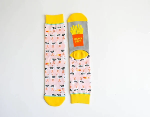 Seagulls and French Fries. French Fries and Seagulls. French Gulls and Sea Fries…wait, what?! We can’t even be mad at these flying snack-stealers ’cause we feel the same way about French Fries! Pale pink background, many many seagulls, some with the prized Fries! Yellow accent at toe, heel and cuff. On the soles, FRENCH FRIES! Each pair of socks is made with high quality woven cotton that feels soft and luxurious and features extra padding in the seamless toes and heels to make your feet extra happy.