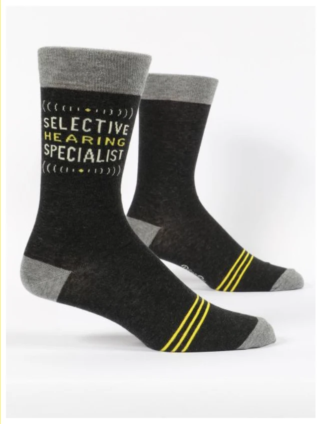 They swear you’ve already had this conversation, but you’re adamant it’s the first time you’re hearing about it. Don’t even pretend anymore. You’ve been caught too many times. Everyone knows you didn’t hear the last thing that was said. You’re just one of a unique team of unique professionals. You’re a “Selective Hearing Specialist”. Be honest with yourself and everyone you know by proudly rocking these funny socks that say “Selective Hearing Specialist”, dark grey background, yellow, white and grey accents. Blue Q donates 1% of the sales of their socks to the humanitarian efforts of Doctors Without Borders. Fits men’s shoe size 7-12, women’s shoe size 8.5-14. Content: 65% combed cotton, 32% nylon, 3% spandex.