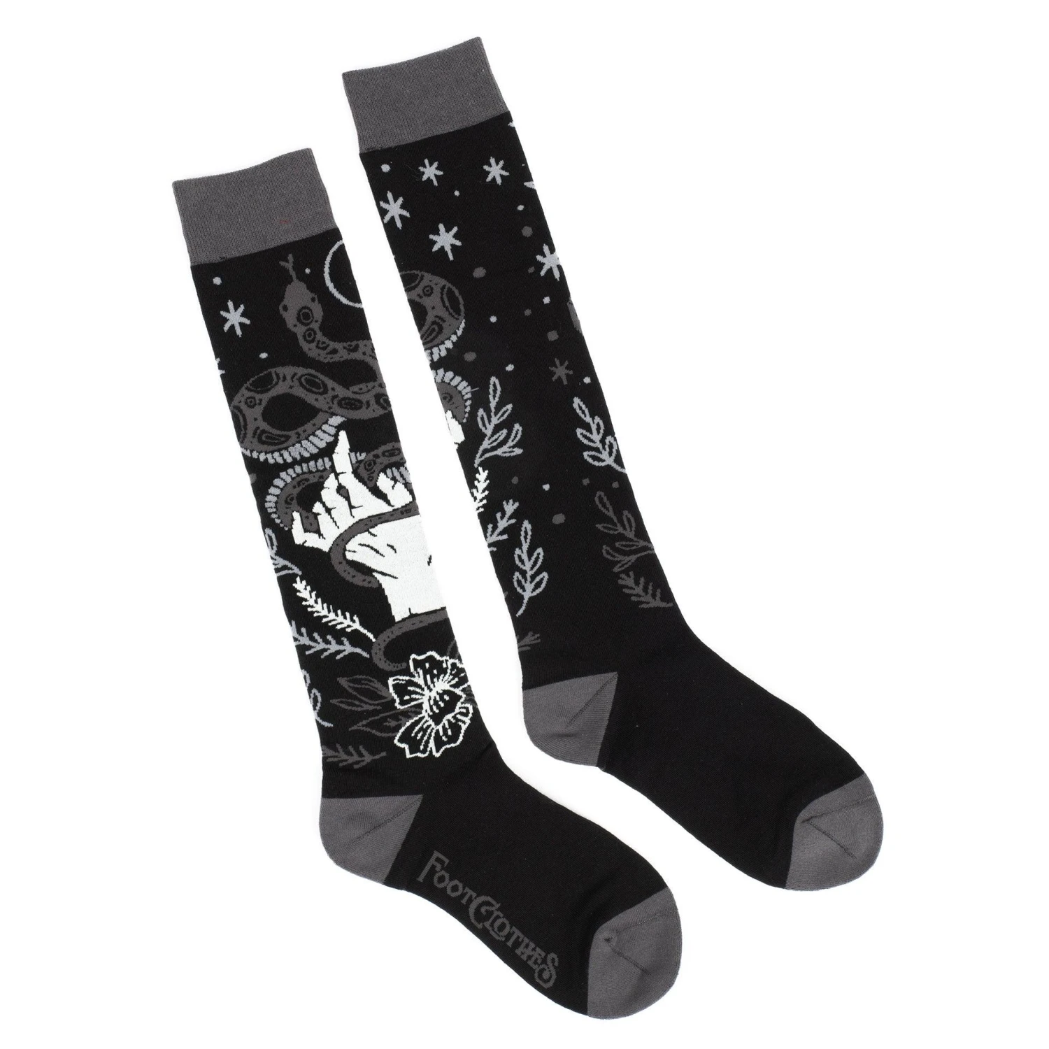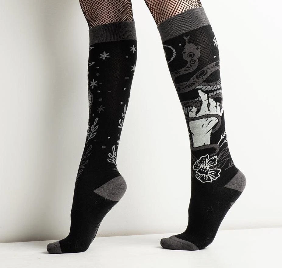 These socks have us under their spell and that spell is cool comfort. These beauties feature a snake wrapping around a hand. Knee high socks are made in shades of black, white and greys. Be comfortable when you are casting a spell in these enigmatic snake socks. Crafted from a super soft cotton blend, double terry in the reinforced heel and toe area and smooth seams add durability and comfort with a high thread count so they’re like fancy sheets – but for your feet!