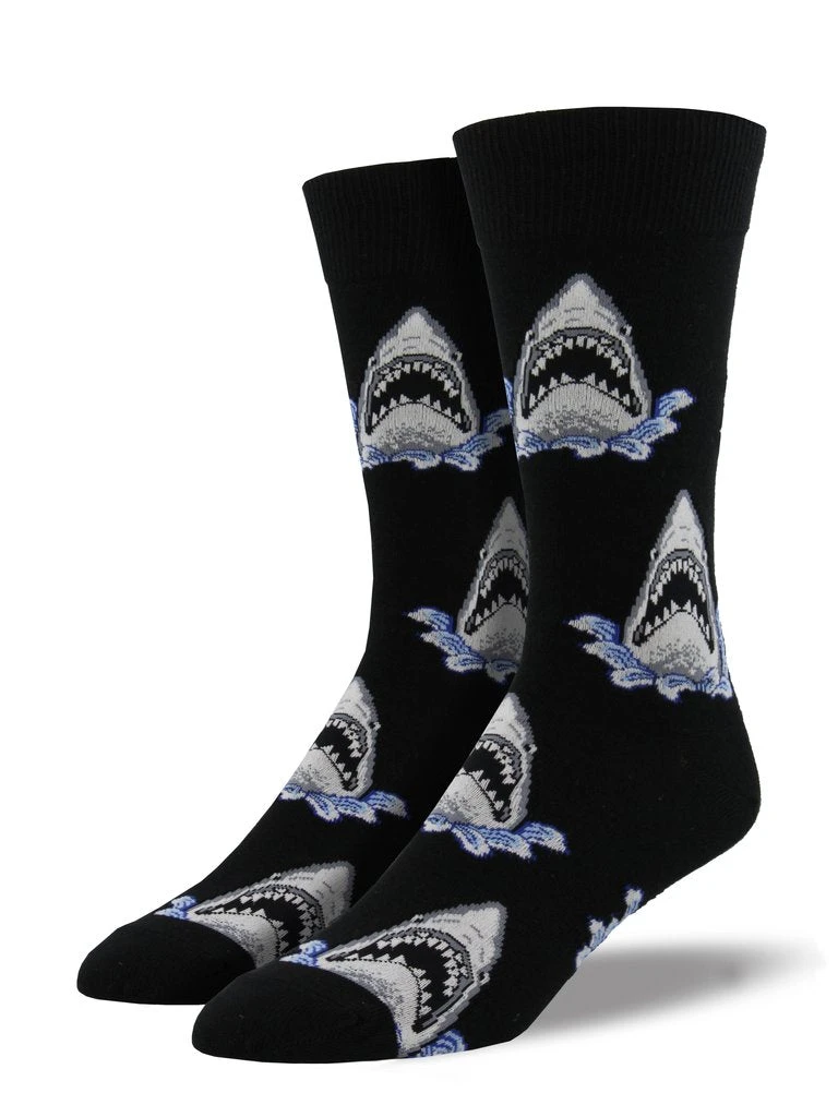 Check out the teeth on these sharks! JAWS has nothing on these toothy Great White Sharks bursting from the ocean depths. Just don’t get a paper cut … These crew socks are perfect to wear after a long day at the beach or for that next board meeting. Featuring a dark sea of black, these socks have mighty sharks popping out in every direction. Fits approximate men’s shoe sizes 7–12.5. 70% cotton, 27% nylon, 3% spandex.