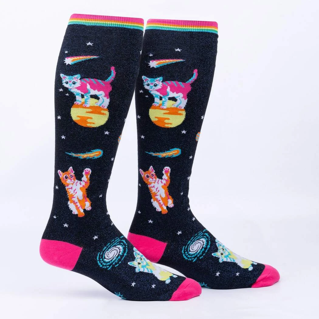 Cats: Infinitely independent, make the perfect candidates to hang out in space. Batting playfully at passing meteors (is this where shooting stars come from?), sitting on high up planets, watching spaceship lasers. These cool socks have metallic threads which makes outer space twinkle and sparkle! Black knee high socks with metallic blue thread and bright pink, orange, yellow, and white cats, planets, and stars. While we aren’t quite sure how zero gravity will affect the behavior of these kitties, we are absolutely sure you will love these fun cat socks from the moment you slip them on.Â