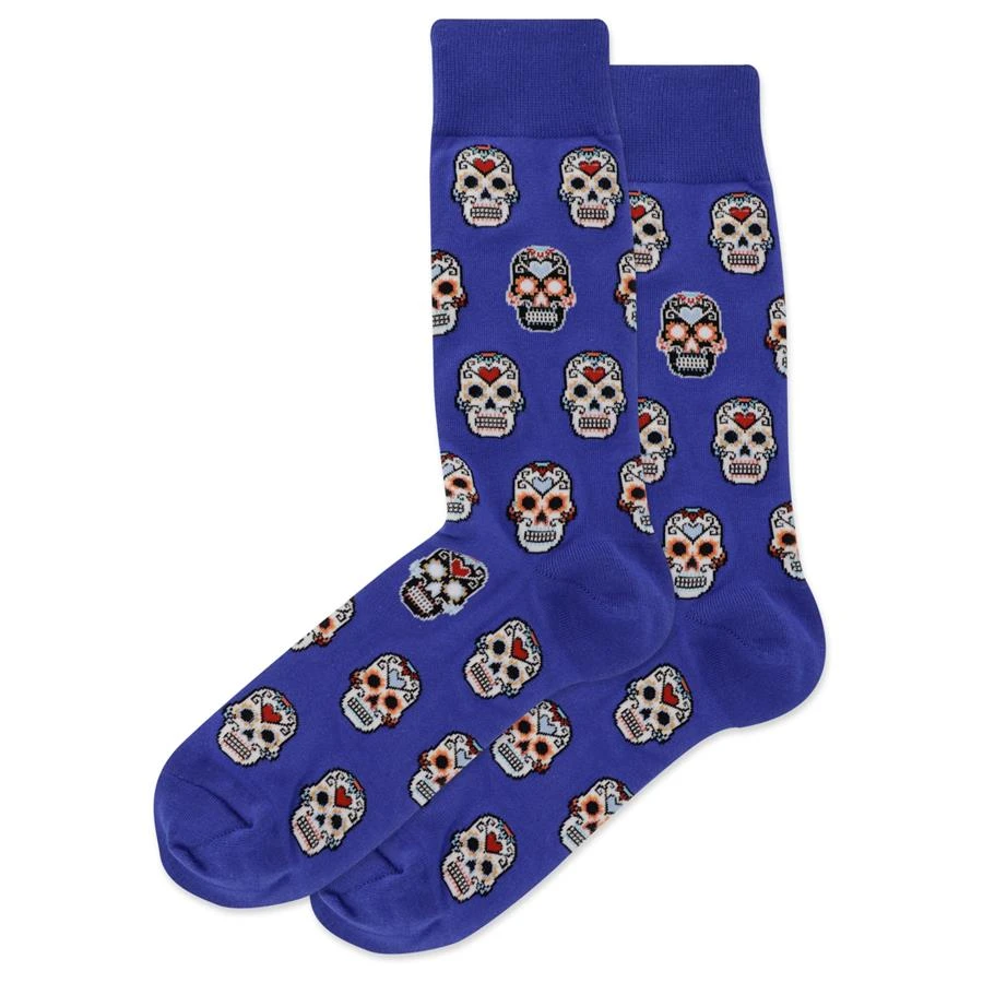 What’s a little bit sweet and a little bit scary? (We’re not talking about you on a moody day or before coffee works its magic.) Colorful Sugar Skulls meet spooky fun on these cool socks for Dia de los Muertos, Halloween and every day! These men’s crew socks feature sugar skulls, or calavera, beautifully embellished with hints of blue, gold, red and purple. They’re an awesome choice for Day of the Dead celebrations, Halloween or any time you want to bring cool style to your look! Originally crafted during Day of the Dead festivities to pay tribute to lost loved ones, these symbols are now spreading across cultural lines as cool and intricate decorations. Don your own sugar skulls and elevate your style to another level. Repeated pattern of colorful assorted Sugar Skulls against a rich blue background. Contents: 44% cotton, 38% polyester, 18% nylon, 2% spandex. Fits approximate men’s shoe sizes 6–12.5.