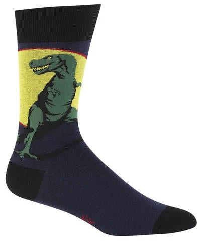 Poor T-Rex, no one ever asks him to high five or play tennis. Make him feel better by putting him on your feet, stat. And don’t let the little arms fool you — this is a tough little dino! Which makes you look tough by association. Lizard green T-Rex (with big teeth!) silhouetted by a warm golden sun with a hint of red against a navy blue sock with black heel, toe and cuff.Â