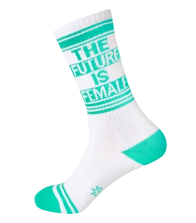 The future is NOW! White with teal text and accents, these wide ribbed athletic style socks reach to mid-calf on most folks and fit a women’s size 6 US to men’s size 15, made in the USA.  65% cotton, 32% nylon, 3% spandex.
