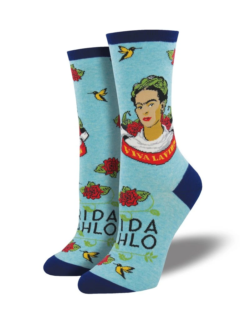 The incredible Frida Kahlo – Mexican artist known for her surrealist self-portraits, her unapologetically vibrant and bold style, as well the pain and the passion that have permeated her entire life. Her influence now stretches across the world. These beautiful socks Featuring Frida’s portrait accompanied by “Viva la Vida,” which loosely translates as, Long Live Life. Viva la Vida is also the title of the last painting that Frida Kahlo did. Despite her deteriorated health, the title of that work is a stunning tribute to life. As one of the most unique artists and thinkers who ever lived, Frida’s fame continues to grow even long after her death in 1954. Light blue background, Kahlo portrait at ankle, her name on top of foot, all surrounded by colorful flowers and birds, deep blue accent at toe, heel and cuff. Officially Licensed Product. Fits women’s approximate shoe size 5-10.5, fits men’s approximate shoe size 3-8. Content: 63% Cotton, 34% Nylon, 3% Spandex.