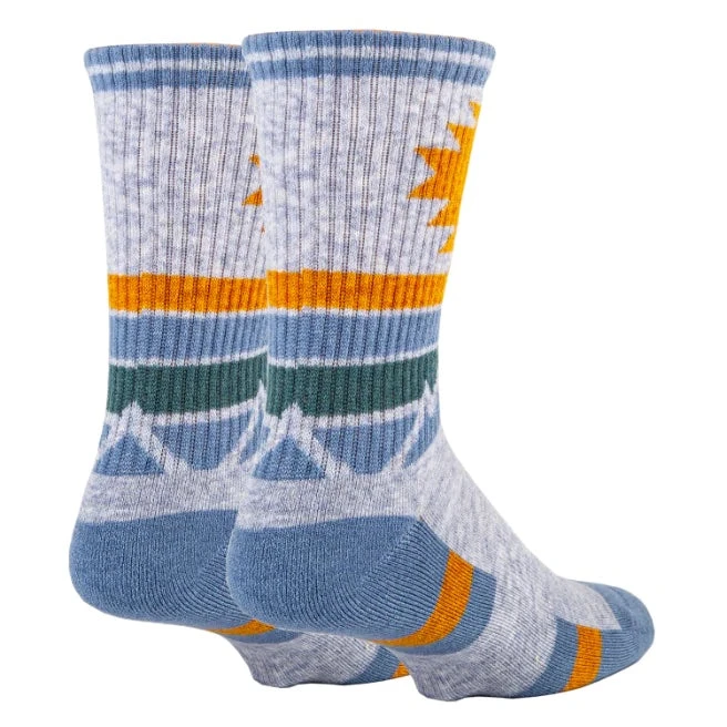 Stylized mountain design with southwestern motifs in blues, gold and teal. Each pair is soft and lightweight, allowing your feet to breathe and stay cool during strenuous activity. Wool is able to react to fluctuations in your body temperature due to tiny pockets of air within the fibers that circulate heat. This means that wool will keep you warm when your body is cold, and cool when it’s hot. It’s like magic.