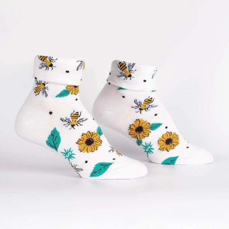 You are no drone. You are a queen. While the drones fly around doing your bidding it might sound like buzzing but what they are really saying is, “Yas Queen.” Did you know these fun turn cuff crew socks can be worn two ways? Fold them down for a floral bee pattern! Wear them up to reveal the secret message! Whether you’re the queen bee or just a lover of these sweet, fuzzy insects, these sweet socks are perfect for you and add some fun to every outfit.The threads in these socks are are certified by OEKO-TEX®, which means harmful chemicals are omitted to keep your skin safe and happy. 57% Cotton, 40% Polyester, 3% Spandex. Fits approximate women’s shoe sizes 5–10 and men’s shoe size 3.5-8.5..
